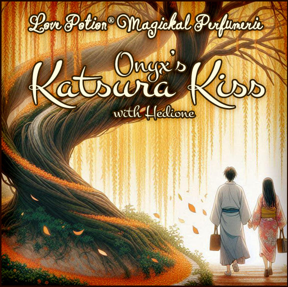 "I would like a scent reminiscent of the moment when Mr. Onyx & I visited this tree called a "weeping katsura". One of its special features is that during autumn, the decaying process of the leaves emits a scent that smells like cotton candy, toffee, or caramel. It's a very nice and refreshing combination of earthy green and sweet, like the Cotton Candy grapes cultivar if you've ever tried it. I'd like to hopefully get close to capturing that moment of walking around feeling and smelling the cool, crisp Autumn air and getting a good whiff of cotton candy/caramel scent from the Katsura tree leaves as they make that transformation from Summer green to Autumn yellow: "Katsura Kiss". AI label image by Onyx.