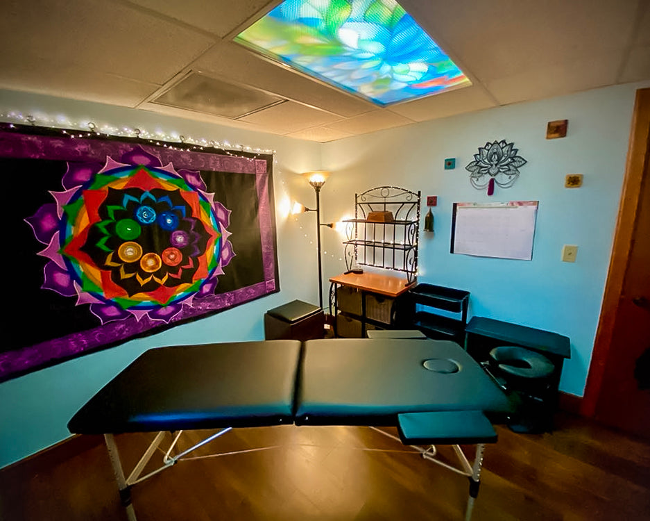 Our massage table and stools have wheels so they can easily be moved around the Room of Requirement as needed. The shelves in the corner are the perfect place for practitioners to display their wares for sale. We have AC and a heater in the room for temperature control, plus a bluetooth speaker and wifi!